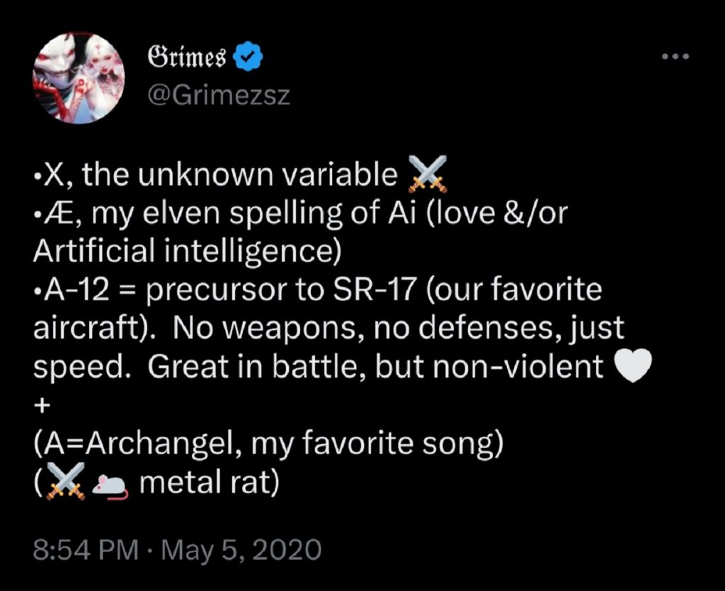 Mother Grimes explained that his name comes from “X is the “unknown variable,” Æ is her “elven spelling of Ai,” and A-12 is a type of CIA aircraft known internally as Archangel.”